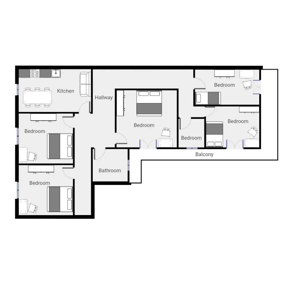 Ogni camera è singola, privata e dotata di tutti i confort necessari: lampada da comò, scrivania, sedia, lampada da tavolo, cassettiera, libreria, armadio 4 ante, specchio, kit letto (lenzuola, federe, cuscini, coperta e ciabatte da camera) e kit bagno (asciugamano grande, medio e piccolo).